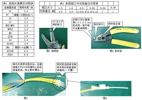 1.确认连接器类型及剥缆长度,钳口的使用(见表1、表2)。 2.弹簧与光缆大小相当,绒毛倒置后,可穿弹簧在绒毛上,保证不会滑出;否则要缠上白色高温胶纸(如图4)。 3.ST/LC/SMA 3.0剥完缆后再穿进铆钉。