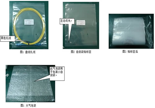 1.本司单双芯跳线尾纤,全部采用图1做法,用黑色扎线。 2.标签贴于自封袋中间。 3.连接器的摆放优先顺序根据标签显示的顺序为从左至右。