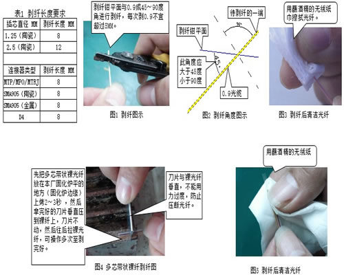 1.确认剥缆长度。(见表1) 2.剥纤动作要求见图2,图4。 3.剥好纤后清洁。(见图3、图5)