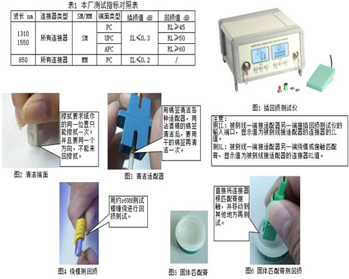 1.使插回损测试仪处于工作状态。(具体操作见《插回损测试仪操作说明》) 2.选择与被侧线匹配的测试线与适配器。 3.清洁测试线端面,适配器。 4.清零。 5.清洁被侧线。 6.测试插回损。