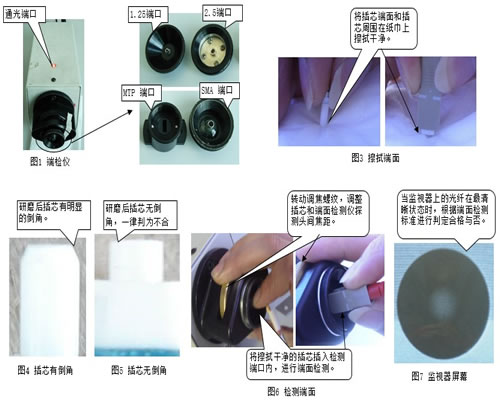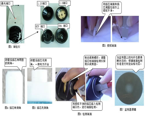 1.选择合适端口,有1.25、2.5、MTP/MPO、MTRJ、SMA等不同端口。见图1,图2. 2.清洁插芯端面,同时检测插芯有无倒角。见图2,图3,图4。 3.调焦至最清晰状态。见图6、图7。 4.根据端面检测标准判定是否合格。