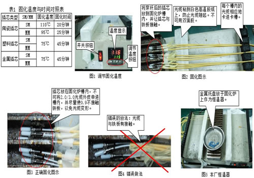 1.各种插芯类型固化温度与时间。见图1 2.将已穿纤的插芯放在槽内。见图2,图3,图4。 3.本厂恒温器。见图5。