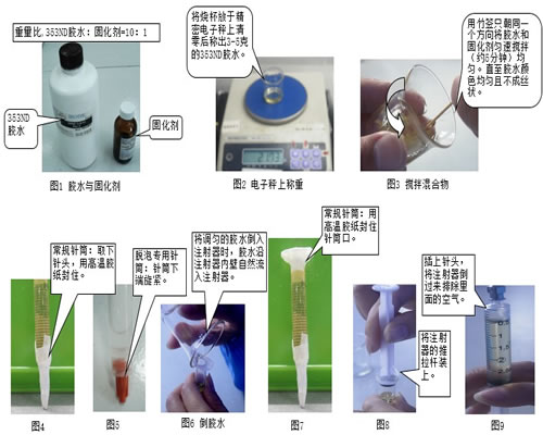 1.调胶的比例为重量比10:1(图1)。 2.称重(图2)。 3.搅拌胶水和固化剂的混合物(图3)。 4.封装针头口(图4、图5),倒胶水倒针筒内(图6)。 5.封针筒口(图7);脱泡专用式针筒搭配的盖子塞好。 6.放入离心机中脱泡4分钟,离心机的具体操作详见《离心机设备指导书》。 7.脱泡完毕后取出针筒,装上推拉杆及针头,将注射器倒过来排除注射器内的空气(图7、图8)。