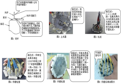 1.切纤。(见图1) 2.插芯式上夹具,扎线。(见图2、图3) 3.插芯式手磨。(见图4) 4.成品式手磨。(见图5) 5.手磨完后放到干净的湿毛巾上轻微擦拭,然后机磨。(见图6)