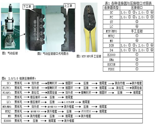 1.不同连接器选择合适钳口。见表1。 2.SC/FC/LC/ST/MU剪绒毛时留约6MM。 3.部分连接器的组转压接步骤见图4. 4.SC或FC压接组装。见左图。