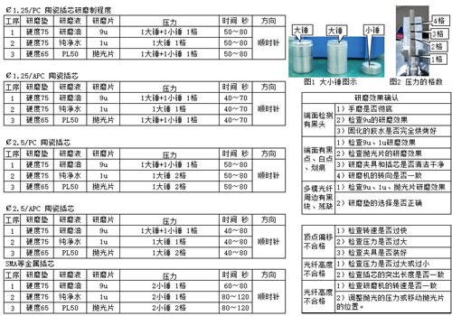 注意事项 1.本研磨制程作为参考,研磨片的新旧等具体情况,压力与时间可作适当调整。 2.本厂研磨机分APC 8000研磨机与普通研磨机两种,其中LC/PC,SC/PC,SC/APC,FC/PC成品式类型的可选择APC 8000研磨机。