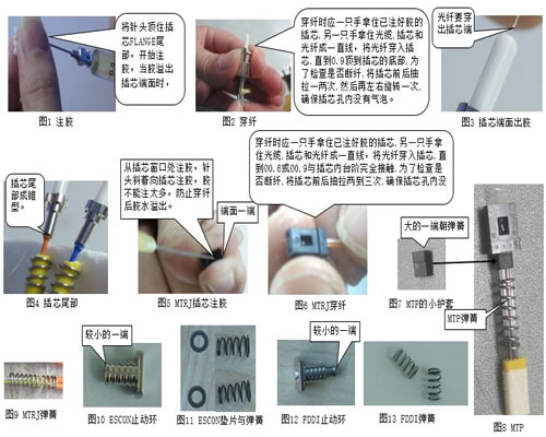 1.注胶:陶瓷插芯见图1;塑料插芯见图6;金属插芯参考陶瓷插芯。 2.穿压接环与弹簧:FDDI、ESCON这两种连接器在剥好纤后要首先穿进止动环(压接环较小的一端朝向尾套,两根0.9穿一个压接环),FDDI穿垫片再穿弹簧(一根0.9穿一个垫片一个弹簧,弹簧小的一端朝垫片),ESCON则穿弹簧(一根0.9穿一个弹簧),然后穿纤,图10~图13;MTRJ则剥好纤后直接穿弹簧,然后穿纤,图5、图6、图9;MTP/MPO则剥好纤后穿弹簧,然后穿小护套(图7、图8),再穿纤图8;其他连接器类型直接进行穿纤。 3.穿纤:穿纤前保证光纤洁净;陶瓷插芯见图2、图3、图4;塑料插芯见图6;金属插芯参考陶瓷插芯。